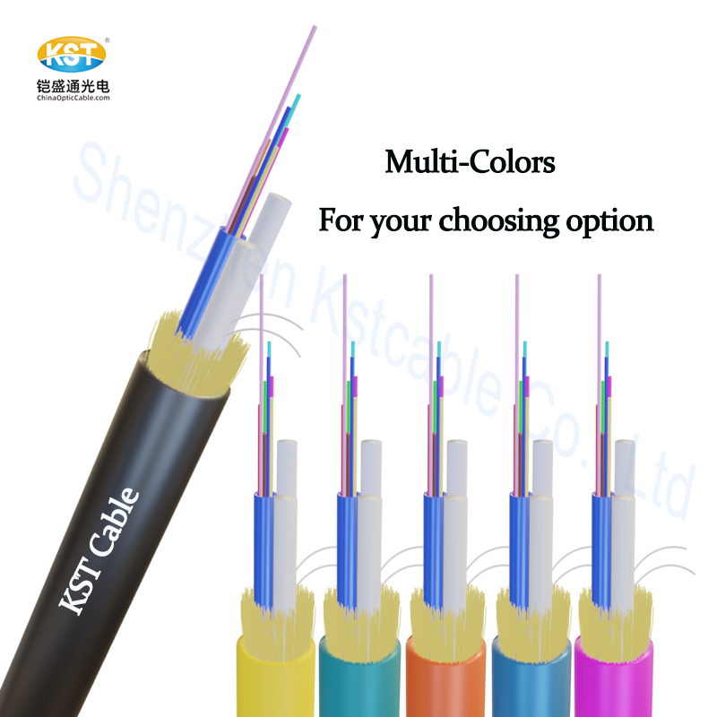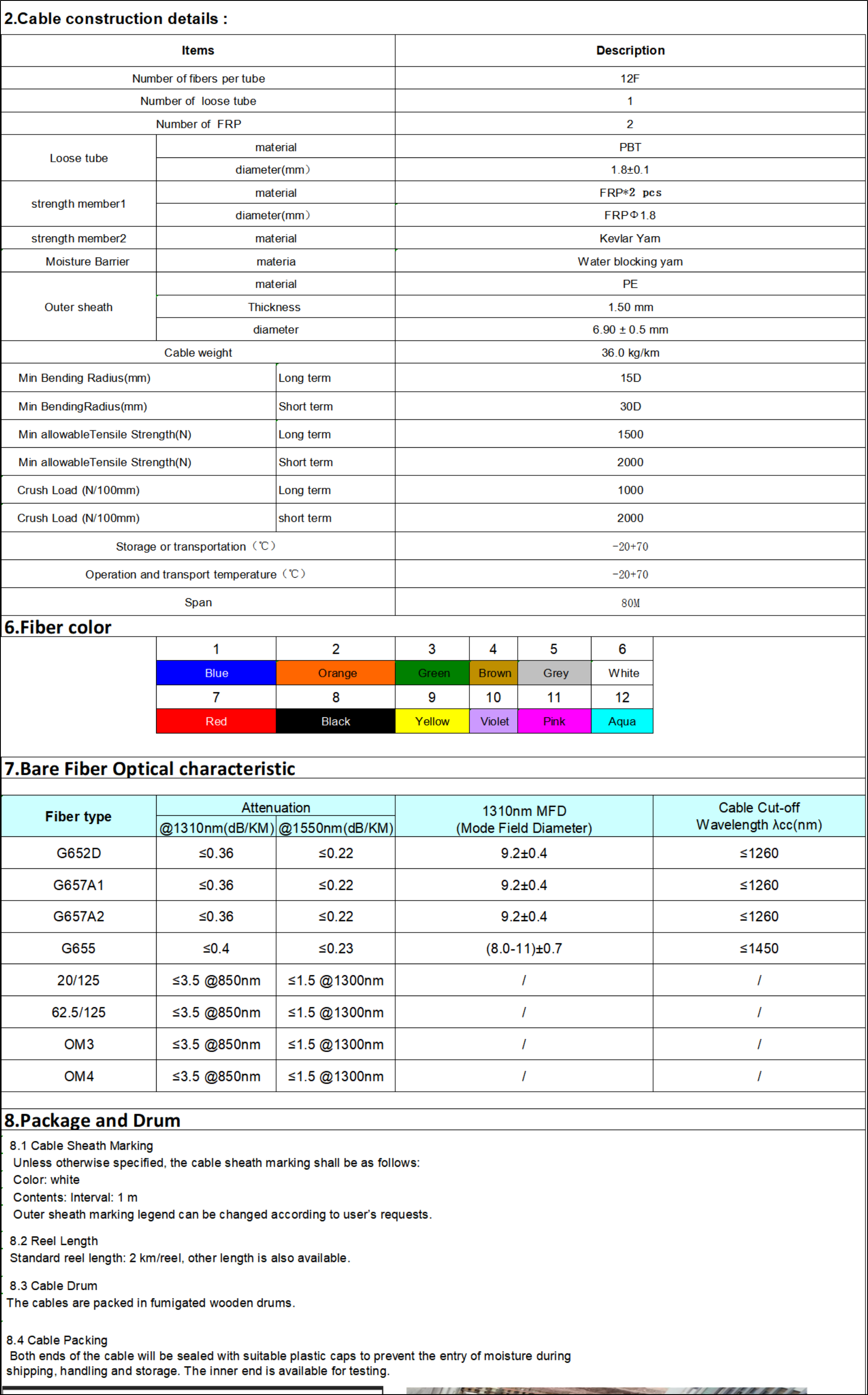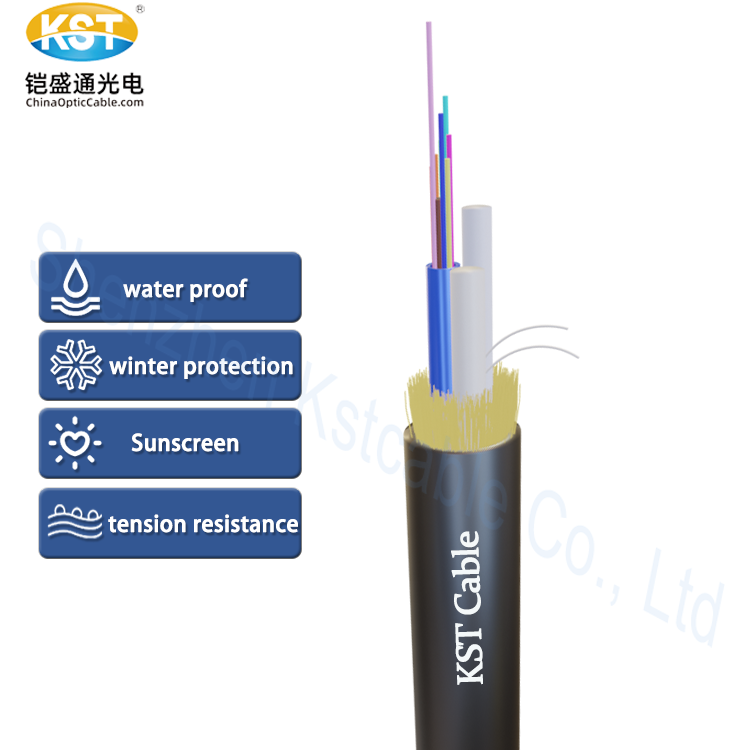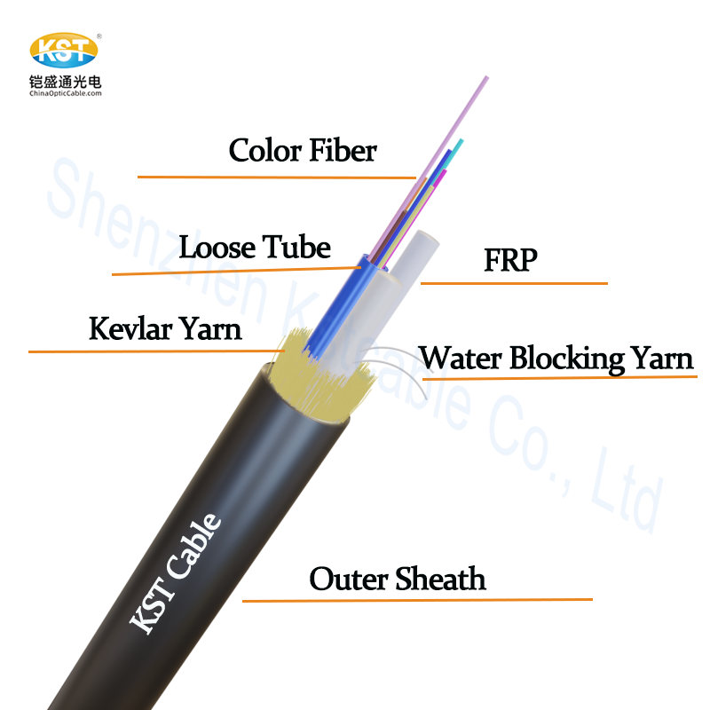 12根彩色光纤被放置在高模塑料的自由管中。管子内填充了防水材料。2根FRP与自由管一起形成稳定的三角形结构,与凯夫拉线一起作为拉伸强度元件。中间的阻水线防止湿气进入,电缆的最外层由具有优异耐寒和耐腐蚀性的PVC制成。